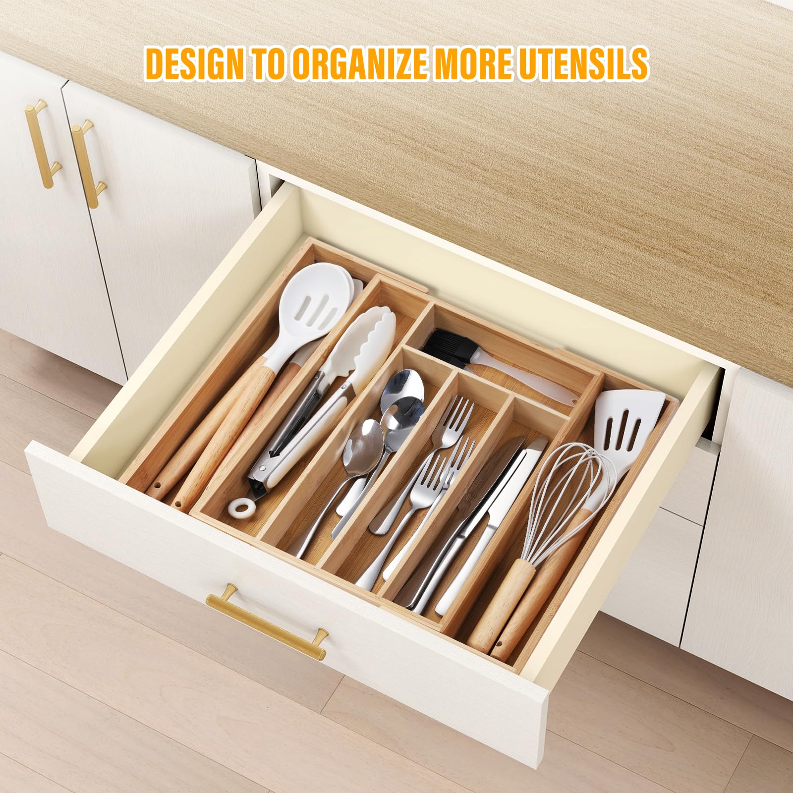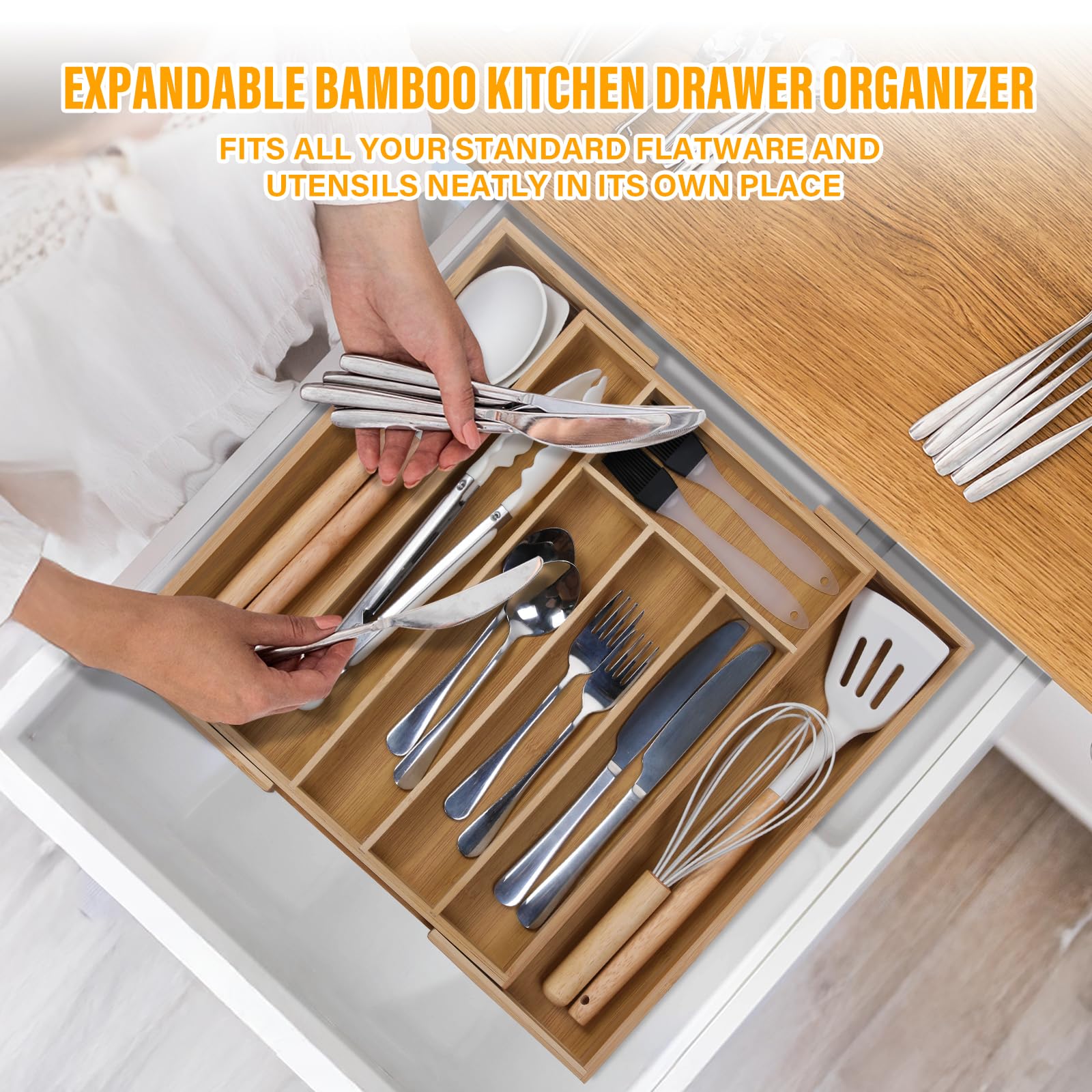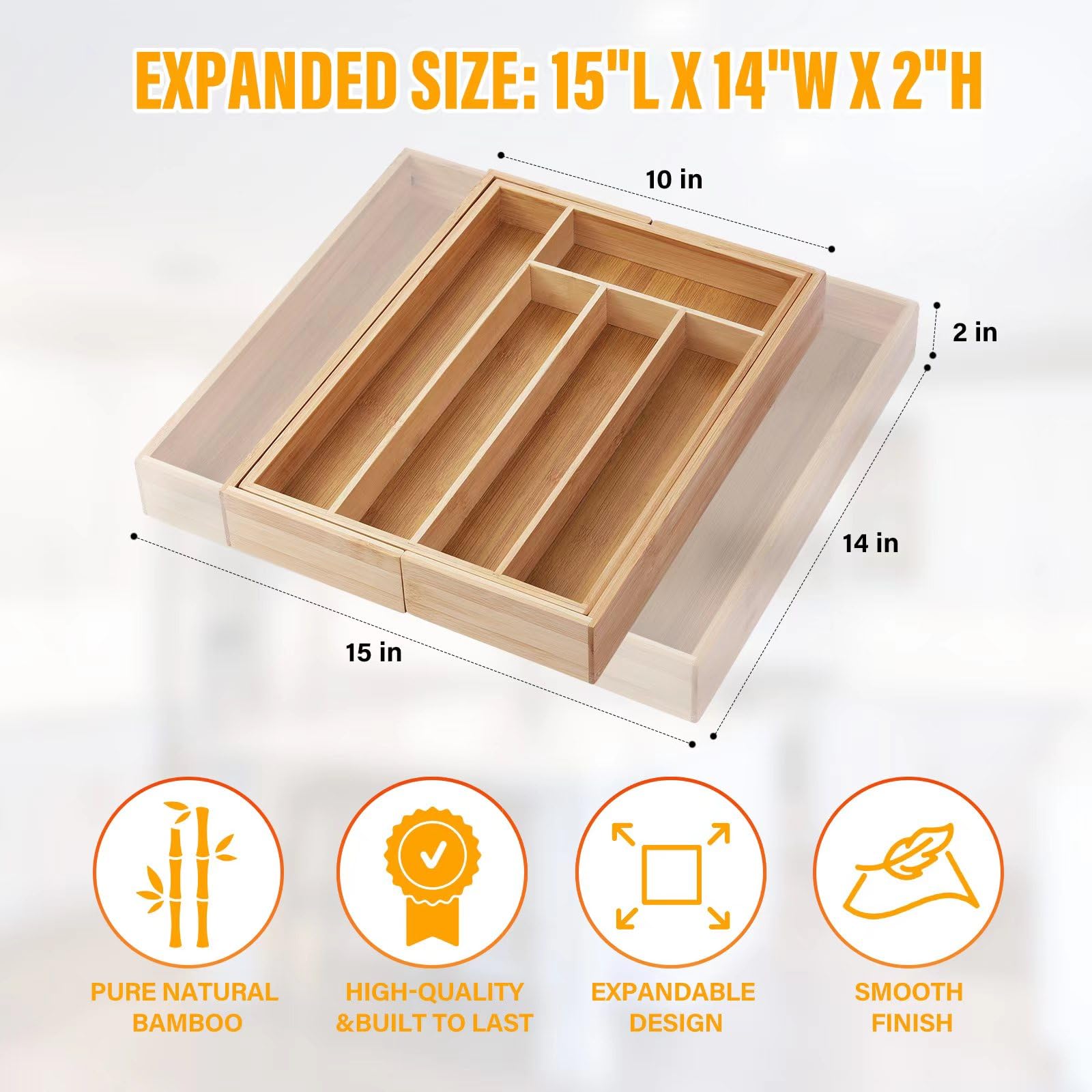 Organisateur de Tiroir en Bambou Extensible – Plateau à Argenterie et Ustensiles de Cuisine – Design Classique et Écologique